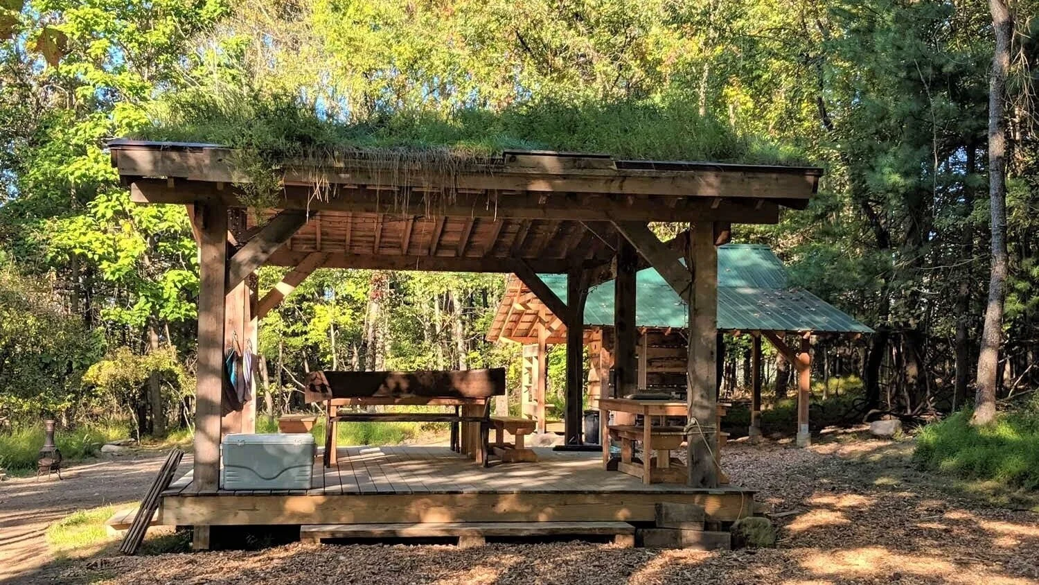 There are two outdoor kitchens with running water, compost toilets and an outdoor shower. Access to a clean pond and stream for swimming.